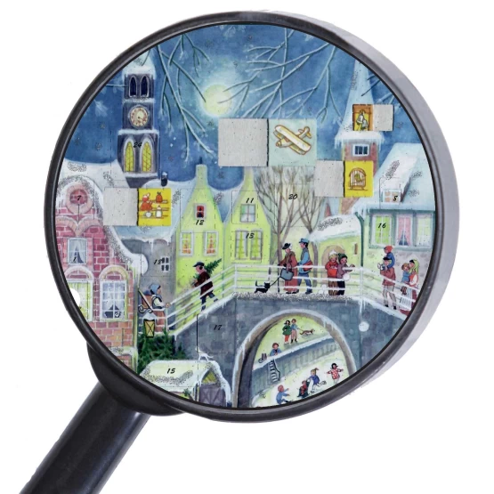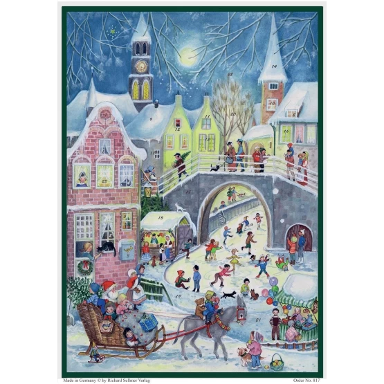 Νοσταλγικό χριστουγεννιάτικο ημερολόγιο που μας γυρίζει πίσω στο χρόνο! Κάτω από τη γέφυρα τα παιδιά κάνουν πατινάζ, ψωνίζουν στη χριστουγεννιάτικη αγορά ή απλά κουβεντιάζουν. Φτάνει κι ο Άγιος Βασίλης με το έλκηθρο γεμάτο δώρα και χαρούμενα παιδιά. Απολαύστε το χειμερινό τοπίο του ημερολογίου!