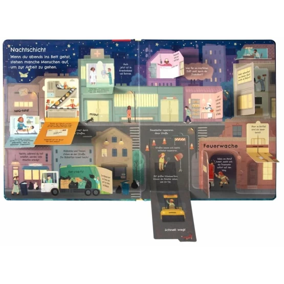 Das Kinderbuch ab 3 Jahren mit 75 spannenden Klappen zeigt Kindern, was in der Welt so los ist, während sie schlafen. Eine Eule fliegt durch den Wald, der Igel raschelt durchs Laub, Bäckerinnen backen das Brot für den nächsten Tag und die Feuerwehr steht bereit für ihren Einsatz. Das wunderschöne Bilderbuch mit detailreich illustrierten Pappseiten und besonders vielen Klappen bietet besonderen Beschäftigungsspaß.