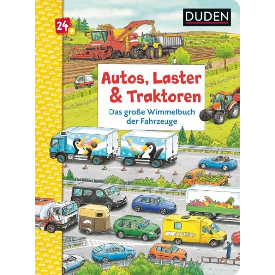 Auf großen Wimmelseiten rund um Autobahn, Baustelle, Bauernhof und Rettungsaktion erkennt man immer wieder neue Dinge. Auf weiteren Seiten staunt man über die groß abgebildeten Fahrzeuge, bei denen wirklich jedes Detail zu sehen ist.