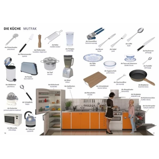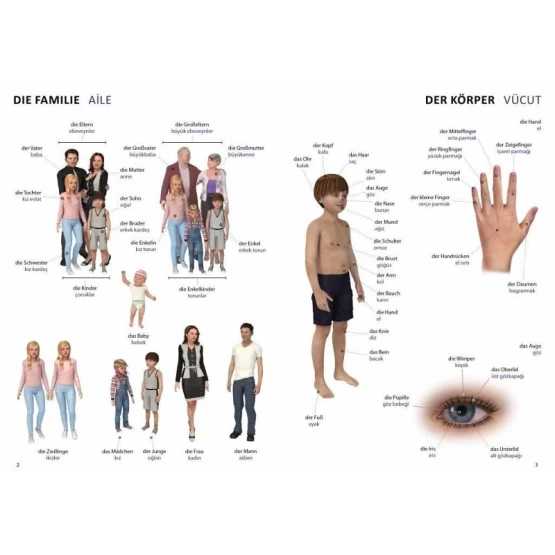 Dieses Bildwörterbuch Türkisch-Deutsch vermittelt den Einstieg in die Fremd- bzw. Zweitsprache. Es erklärt anhand von detailgetreuen Abbildungen und liebevoll gestalteten Szenen rund 900 Wörter aus dem täglichen Lebensumfeld der Kinder. Dazu gehören 34 Themen wie Familie, Haus, Schule, Stadt, Tiere, Zeit, Wetter, Musik, Sport und Feiertage.