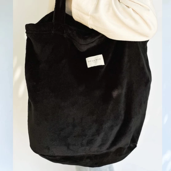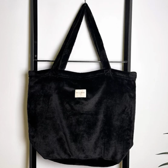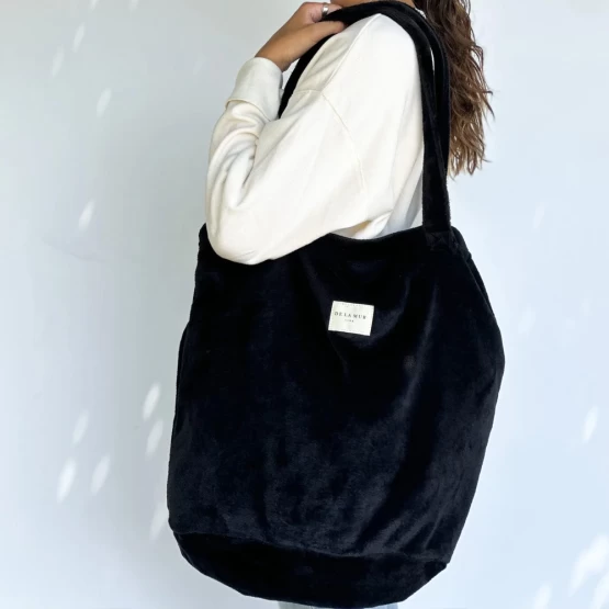 Μεγάλη τσάντα shopper με λουριά ώμου. Κατασκευασμένη από χοντρό, απαλό ύφασμα μαύρης γούνας. Για σωστή συντήρηση, συνιστάται πλύσιμο στο χέρι με κρύο νερό και αποφυγή χρήσης στεγνωτηρίου.