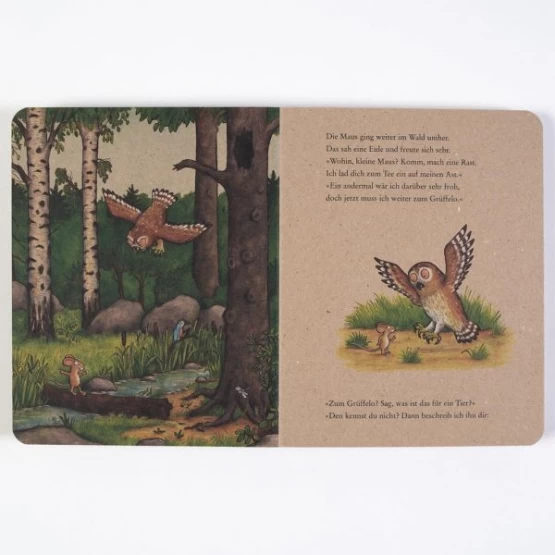 Der große Wald ist voller Gefahren. Da ist es gut, wenn man einen starken Freund hat. Und wenn man keinen hat, muss man einen erfinden. Die kleine Maus droht jedem, der sie fressen will, mit dem schrecklichen Grüffelo. Dabei gibt es den Grüffelo gar nicht. Oder doch?Der beliebte Bilderbuchklassiker - zu 100% mit Recyclingkarton und Ökofarben in Deutschland produziert.