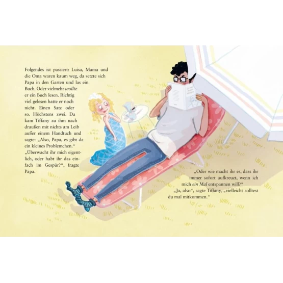 Luisa, Mama und die Oma waren kaum weg, da setzte sich Papa in den Garten und las ein Buch. Oder vielmehr wollte er ein Buch lesen. Richtig viel gelesen hatte er noch nicht. Einen Satz oder so. Höchstens zwei. Da kam Tiffany zu ihm nach draußen mit nichts am Leib außer einem Handtuch und sagte: "Also, Papa, es gibt da ein kleines Problemchen."
