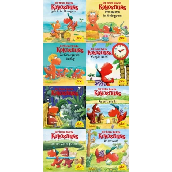 Der kleine Drache lernt die Uhrzeit und erfährt, warum Zähneputzen so wichtig ist. Im Dschungel wird ihm dann doch ein bisschen mulmig, aber zum Glück lässt er sich nicht so schnell einschüchtern. Acht liebevolle Pixi-Geschichten mit dem großen Kinderbuch-Helden Drache Kokosnuss!