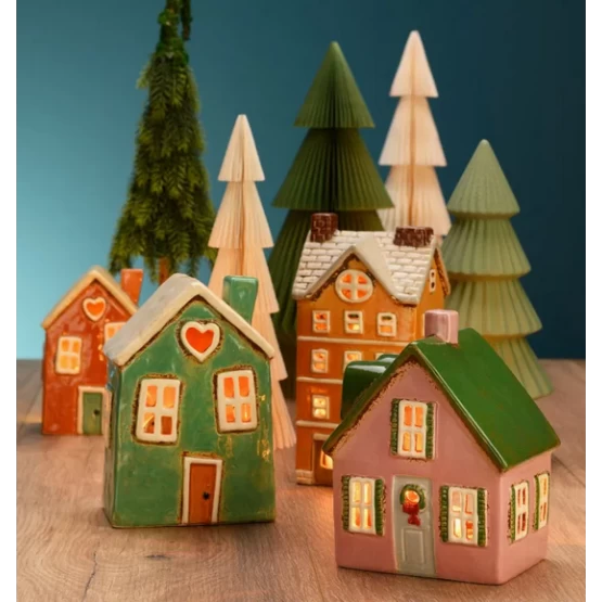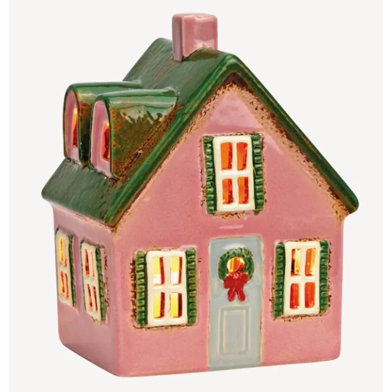 Αυτό το προσεκτικά σχεδιασμένο κεραμικό σπίτι σε γιορτινό ροζ και πράσινο φέρνει τη μαγεία των Χριστουγέννων απευθείας στο σπίτι σας. Με λεπτομερή στοιχεία όπως ένα χριστουγεννιάτικο στεφάνι, το σπιτάκι γίνεται το λαμπερό κεντρικό σημείο για το χειμώνα και τα Χριστούγεννα. Με ή χωρίς κεριά - το σπίτι από κεραμικό/πορσελάνη δημιουργεί σε κάθε περίπτωση μια ζεστή και γιορτινή ατμόσφαιρα. Ιδανικό ως χριστουγεννιάτικο στολίδι. Ένα σπίτι γεμάτο χαρά των Χριστουγέννων - για να ονειρευτείτε, να θαυμάσετε και να στολίσετε