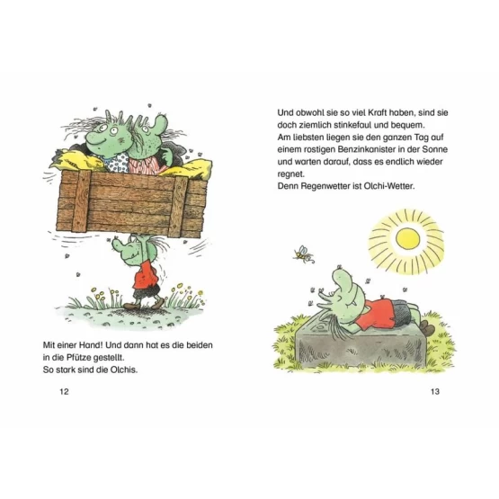 Die Olchis sind, wie man mit einem Blick erkennen kann, ganz besonders liebreizende Geschöpfe. Sie leben in der Nähe von Müllbergen und Abfallgruben, verströmen einen entsprechenden Geruch und sind immer von Fliegenschwärmen umgeben. Sie ernähren sich von Blechbüchsen, Autoreifen und Haarschampon und sind so stinkefaul, dass sie die meiste Zeit in der Sonne verdösen. Bis sie vor lauter Nichtstun auf die verrücktesten Ideen kommen...