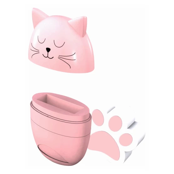 Doppelspitzer aus Aluminium gepaart mit einem Radiergummi in Katzenpfoten-Form in Kunststoffgehäuse mit Kappe und Deckel.