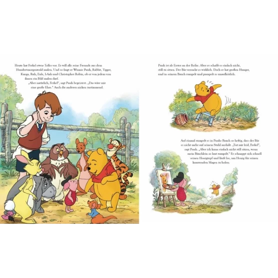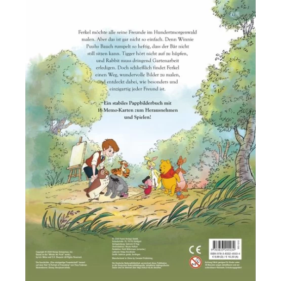 Ferkel möchte alle seine Freunde im Hundertmorgenwald malen. Aber das ist gar nicht so einfach. Denn Winnie Puuhs Bauch rumpelt so heftig, dass der Bär nicht still sitzen kann. Tigger hört nicht auf zu hüpfen, und Rabbit muss dringend Gartenarbeit erledigen. Doch schließlich findet Ferkel einen Weg, wundervolle Bilder zu malen und entdeckt dabei, wie besonders und einzigartig jeder Freund ist. Ein stabiles Pappbilderbuch mit 16 Memo-Karten zum Herausnehmen und Spielen!