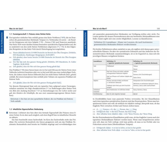 »Duden - Die Grammatik« ist das Standardwerk zur deutschen Grammatik. Es beschreibt den Aufbau der deutschen Sprache anhand der Einheiten Satz, Wortgruppe und Wort umfassend und fundiert. Jede Einheit wird ausführlich behandelt und mit Querschnittsthemen wie Text, Stil, gesprochene Sprache, Prosodie, Orthografie sowie Variation und Sprachwandel in Verbindung gesetzt. Die Grammatik enthält zahlreiche Tabellen, Klassifikationen, Infokästen und Beispiele aus Textsammlungen für ausführliche grammatische Analysen.