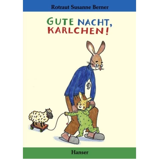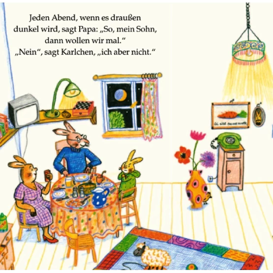 Auch Karnickel-Kinder wollen abends nicht gern schlafen gehen: In "Gute Nacht, Karlchen!" spielt Papa mit Karlchen Pantoffelexpress. Erst geht's nach Esslingen in die Küche, danach ins Bad nach Feuchtlingen und dann zur Endstation Bettlingen. Nach so einer abendlichen Reise kann man wunderschön träumen.