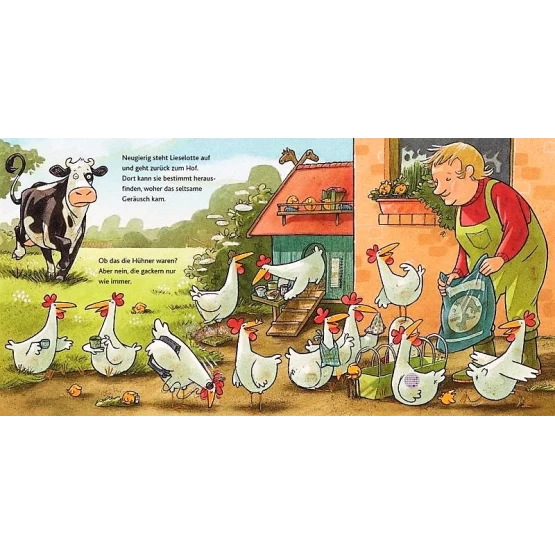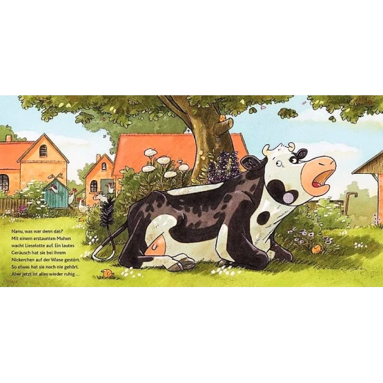 Die Kuh Lieselotte wird von einem seltsamen Geräusch geweckt. So etwas hat sie ja auf dem Bauernhof noch nie gehört! Sie schaut überall nach, aber weder die gackernden Hühner, noch die Schweine auf dem Traktor machen so ein seltsames Geräusch. Was kann das nur gewesen sein?