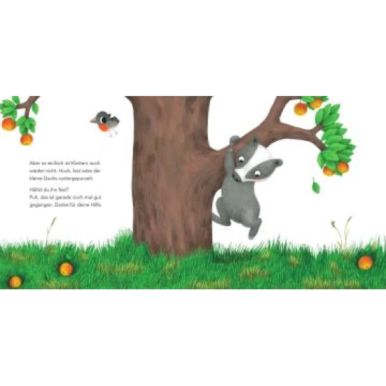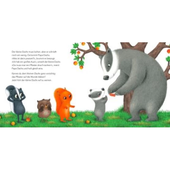 Plumps, da sitzt der klein Dachs im Gras. Nur ein kleiner Kratzer, aber der Schreck ist groß. Schnell sind seine Freunde zur Stelle. Die kleine Eule streichelt den kleinen Dachs sanft, das Eichhörnchen pustet kräftig und das Stinktier macht wie immer Quatsch. Endlich kommt Papa Dachs mit einem Pflaster und nimmt ihn in den Arm. Alles wieder gut!