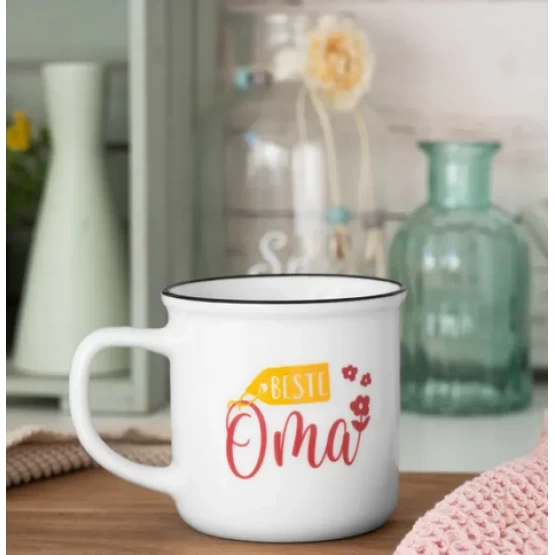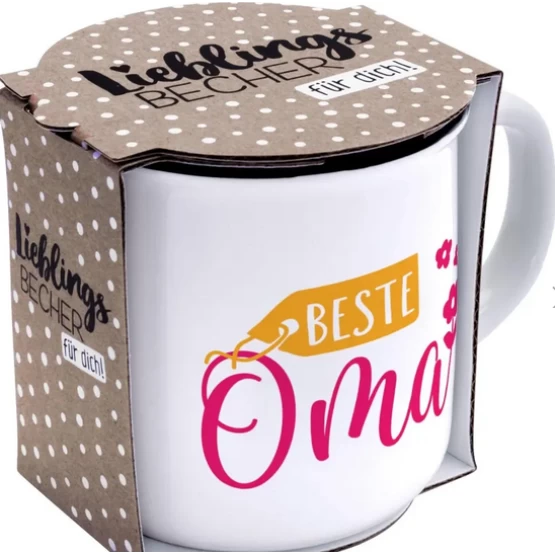 Genau dieser liebevolle Becher in Emaille-Optik fehlt noch bei Deiner Oma im Tassenschrank! Mit der herzlichen Aufschrift »Beste Oma« wird sie sich riesig darüber freuen und jedes Mal an Dich denken, wenn sie daraus trinkt.