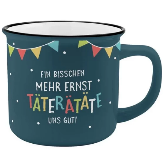 Becher aus New Bone China Porzellan, Kaffeebecher in nostalgischer Emaille-Optik. Tasse mit Spruch "Ein bisschen mehr Ernst täterätäte uns gut!" und Golddruck, Volumen ca. 35 cl.