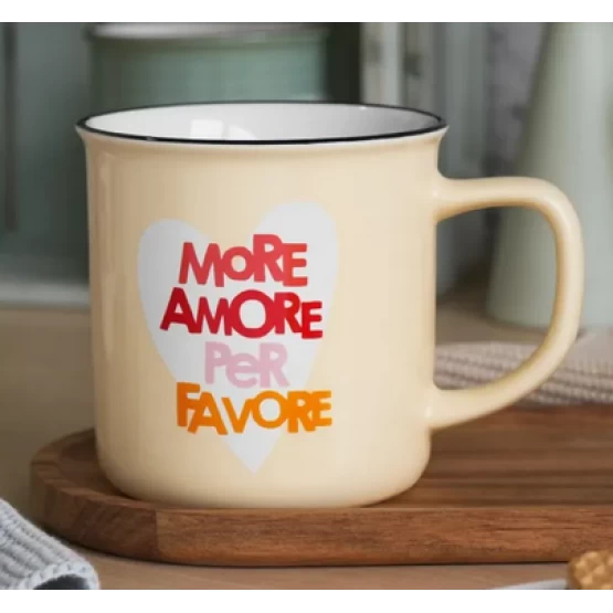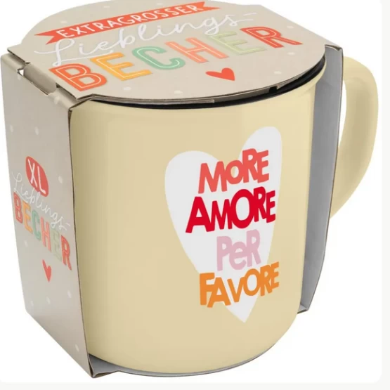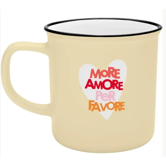 Αυτή η κούπα XL με την επιγραφή «More Amore per favore» μας χαρίζει πάντα ένα χαμόγελο, καθώς αυτά τα λόγια είναι τόσο παιχνιδιάρικα και γοητευτικά, όπως μια λιακάδα σε γκρίζες μέρες - μια πρόσκληση να ανοίξουμε την καρδιά μας για περισσότερο «Amore».