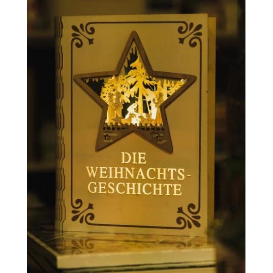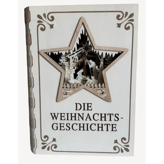 Weihnachtsdekoration in Buchform, die die Krippe und die Geburt Christi darstellt. Es ist aus Holz gefertigt und kann jeden Raum schön beleuchten und schmücken