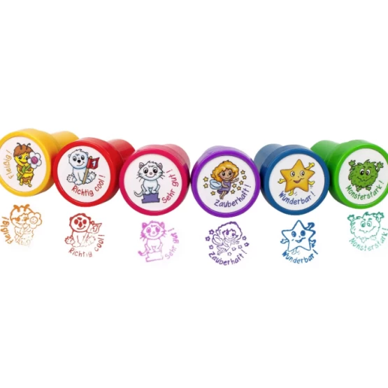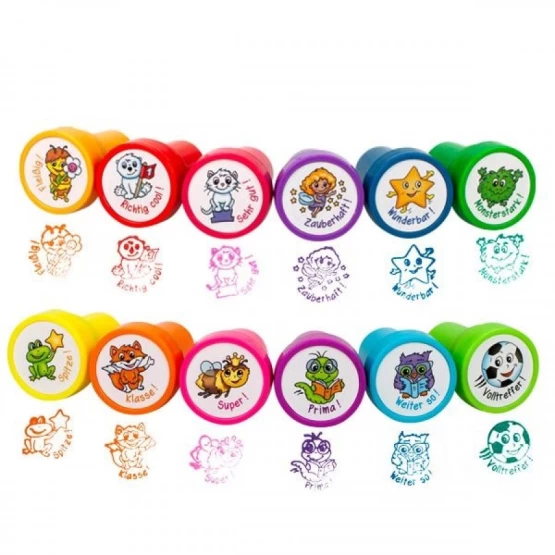 Εκπαιδευτική σφραγίδα σε 12 διαφορετικά σχέδια: Fleißig - Richtig cool - Sehr gut - Zauberhaft - Wunderbar - Monsterstark - Spitze - Klasse - Super - Prima - Weiter so - Volltreffer