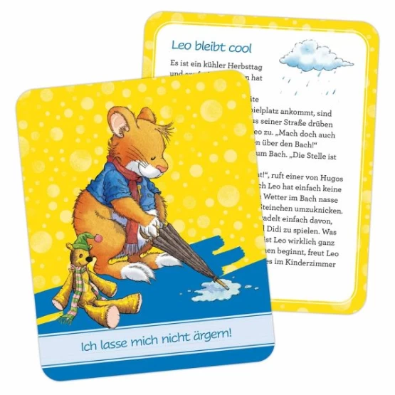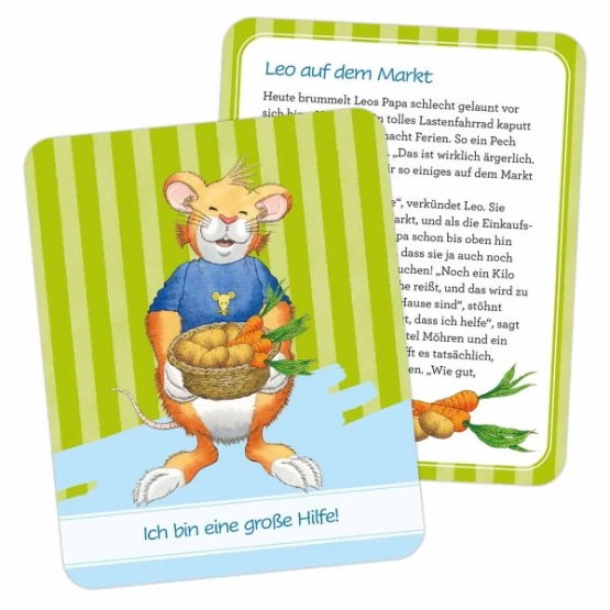 „Ich kann das!“ „Ich bin mutig!“ „Ich bin schlau!“. Selbstbewusste und positive Glaubenssätze sind in der Kindheit besonders wichtig. Denn dann sind sie besonders wirkungsvoll. Auch Leo Lausemaus entdeckt, dass er Vieles schaffen kann, wenn er an sich glaubt. So fällt ihm immer etwas Lustiges ein, er findet immer eine Lösung für sich und seine Freunde und er weiß, dass er etwas Neues schaffen kann. Auf 20 Stark-Mach-Karten bestärkt Leo Lausemaus schon die Kleinsten darin, sich selbst Mut zuzusprechen. Mit seinen bestärkenden Affirmationen und kurzen eigängigen Geschichten dazu, vermittelt Leo Lausemaus Selbstvertrauen und einen guten Umgang mit starken Gefühlen. Einfach eine Karte ziehen, den Glaubenssatz vorlesen lassen und die passende, kurze Geschichte dazu auf der Rückseite lauschen. Wenn Leo das kann, kannst du das auch!