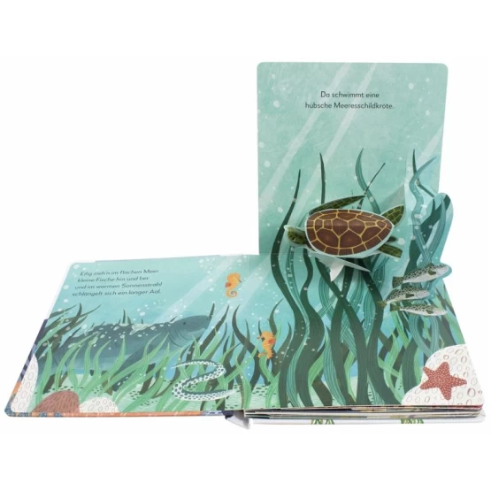 Auf ganz wunderbare Weise regt dieses Kinderbuch ab 2 die Fantasie von Kleinkindern an: Das hochwertige Pappbilderbuch zeigt in 5 eindrucksvoll großen 3-D-Pop-ups die Vielfalt und das Leben der Tiere im Meer. Schöne Reime laden Kinder zum Gespräch über die Welt der Ozeane ein. Dabei werden sie aus dem Staunen über riesige Meeresschildkröten, leuchtend bunte Clownfische und verspielte Seeotter nicht mehr herauskommen.