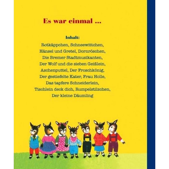 Rotkäppchen - Schneewittchen - Hänsel und Gretel - Dornröschen - Die Bremer Stadtmusikanten - Der Wolf und die sieben Geißlein - Aschenputtel - Der Froschkönig - Der gestiefelte Kater - Frau Holle - Das tapfere Schneiderlein - Tischlein deck dich - Rumpelstilzchen - Der kleine Däumling.