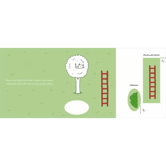 Tatütataaa! Feuerwehrauto, Blaulicht oder Katze auf dem Baum - jede kleine gereimte Geschichte ergibt ein Bild, das Kinder ab 3 Jahren mit einer Kinderschere, einem Kleber und bunten Stiften vervollständigen können.