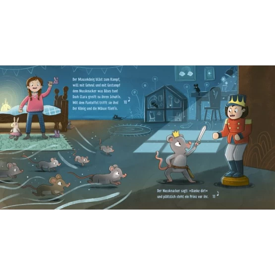 Wenn die Kinder gemeinsam um den Weihnachtsbaum tanzen und Clara den Nussknacker gegen die Mäuseschar verteidigt, fiebern kleine Zuhörer_innen gespannt mit. Ein Ausflug ins Zauberland? Wie aufregend! Die Geschichte von Nussknacker und Mausekönig fasziniert seit Generationen, in allen Versionen. Das Bilderbuch in Reimen mit bunten Illustrationen und musikalischer Begleitung bietet einem jungen Publikum einen gelungenen Einstieg in klassische Musik.