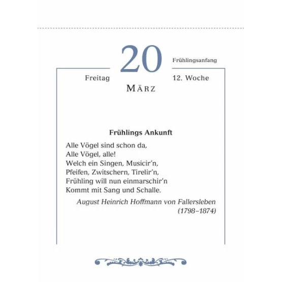 Die schönsten und bekanntesten Gedichte deutscher Dichterinnen und Dichter begleiten uns mit diesem Kalender durch das Jahr 2026. Treten Sie mit dieser wahren Fundgrube eine Entdeckungsreise in die Welt der deutschen Lyrik an. Für jeden Gemütszustand, jede Jahreszeit, jede Lebens- und Wetterlage gibt es hier im Jahreslauf ein passendes Gedicht. Freuen Sie sich auf ein Jahr voller schöner Worte!