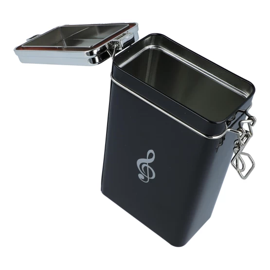 Μεταλλικό δοχείο για καφέ ή και κάθε άλλη χρήση με τυπωμένο μουσικό κλειδί. Το ασημένιο καπάκι κλείνει ερμητικά το δοχείο και ανοίγει εύκολα με μεταλλικό κούμπωμα. Χωρητικότητα: 250 γραμμάρια.