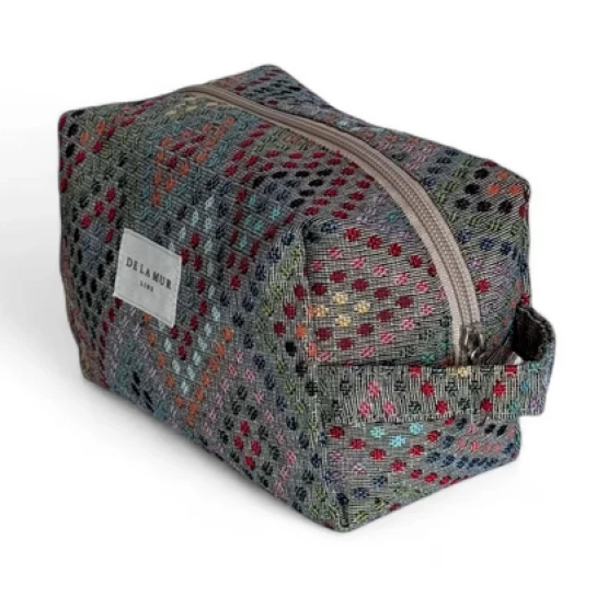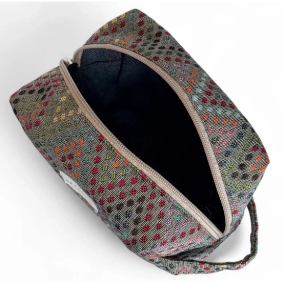 Mittelgroßer Kulturbeutel mit Reißverschluss oben und seitlichem Tragegriff. Gefertigt aus dickem Jacquard-Gewebe mit mehrfarbigem geometrischem Muster.