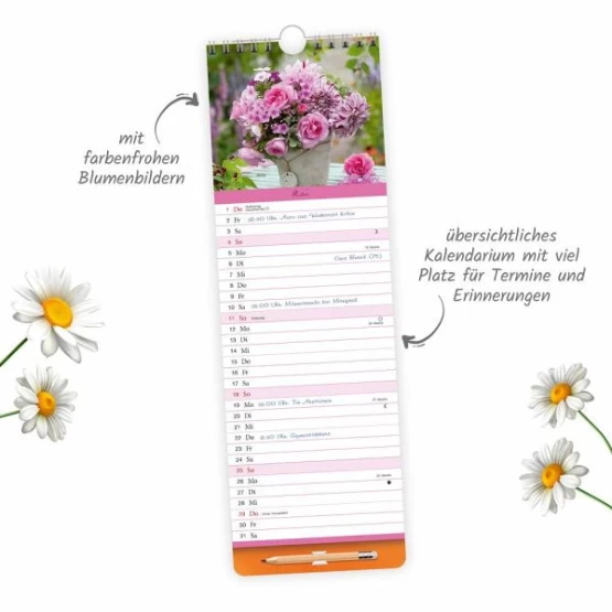 Unser hochwertig verarbeiteter Notizkalender mit Stift BLUMEN erfreut mit liebevollen Sprüchen sowie mit farbenfrohen Fotomotiven, welche die Seele beruhigen und erfreuen. So kommt Monat für Monat aufs Neue Freude und Inspiration in die eigenen vier Wände oder ins Büro. Außer als Hingucker und Schmuckstück hilft der Kalender dank des gut ablesbaren Kalendariums, markierter Feiertage, der Mondphasen und reichlich Platz für Notizen auch wunderbar beim Organisieren des Alltags.