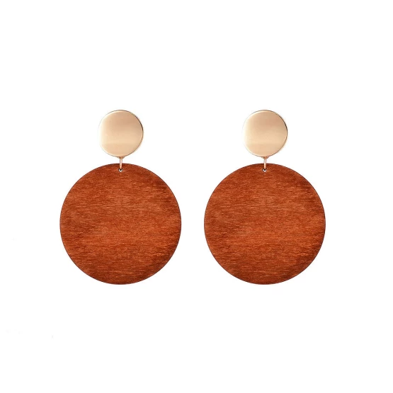Σκουλαρίκια κρεμαστά που δένουν κολλητά στο αυτί. Αποτελούνται από δυο δίσκους έναν μικρό μεταλλικό επιχρυσωμένο και έναν μεγαλύτερο ξύλινο σε καφέ απόχρωση.