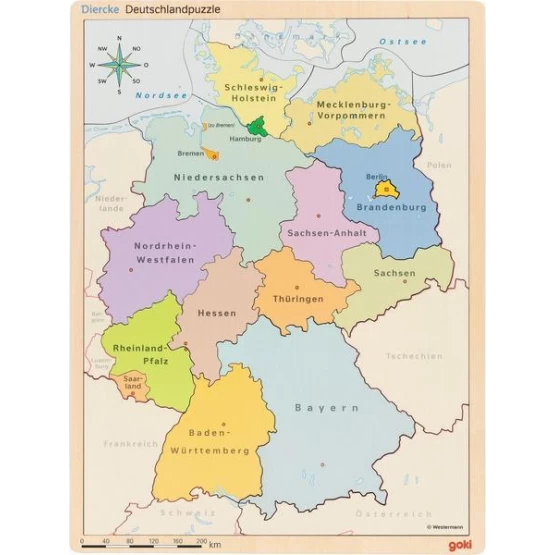 Pipp - das große Deutschlandlernpuzzle. In der Zusammenarbeit mit dem Diercke Verlag und goki entstand dieses einzigartige, dreischichtige Lernpuzzle. Die hochwertigen Puzzleebenen aus Holz können gegeneinander ausgetauscht werden. So lassen sich Gebirge, Flüsse, Bundesländer, Landeshauptstädte aus unterschiedlicher Sicht zuordnen und der vertiefende Lerneffekt stellt sich fast von alleine ein. Diercke hat das Know-how die Welt exakt zu vermitteln - mit goki geht die Umsetzung spielerisch. Gemeinsam wünschen wir viel Freude beim "Lernspielen"!