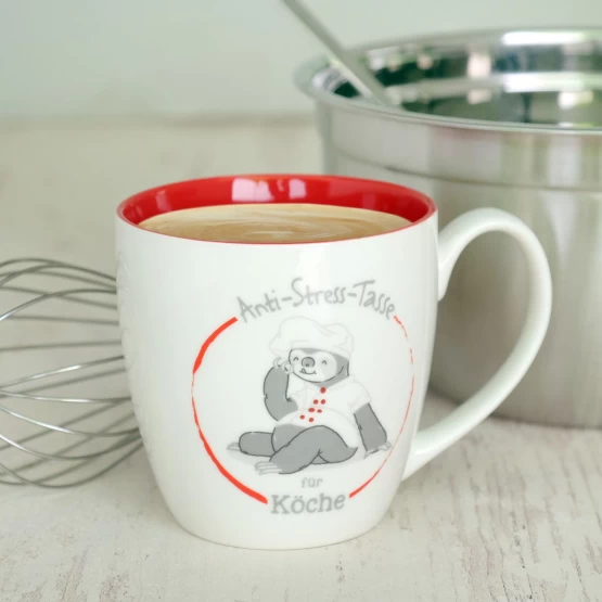Im Mittagsgeschäft muss man als Koch fleißig den Kochlöffel schwingen. Aber wenn die Arbeit gemeistert ist, darf man sich auch mal eine kleine Pause gönnen. Mit der Anti-Stress-Tasse kann man bei Kaffee und Kuchen einfach mal die Beine hochlegen und den stressigen Arbeitsalltag hinter sich lassen.