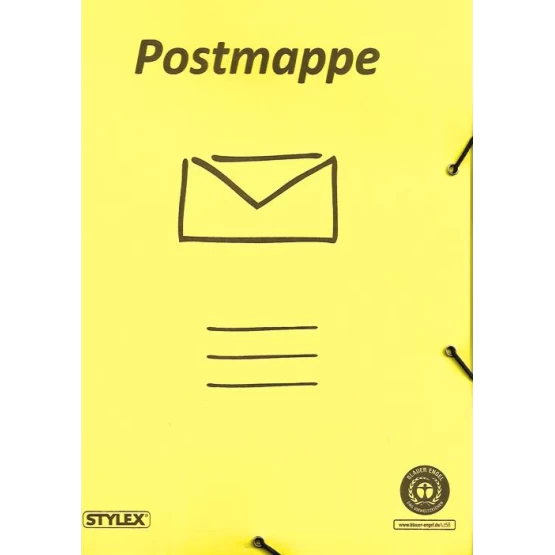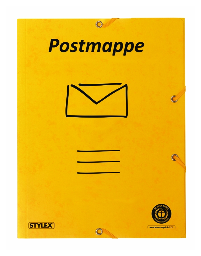 Dreiklappmappe, DIN A4, Gelb, Kartonmaterial aus 100% Altpapier, mit Aufdruck "Postmappe", inkl. drei Klappen am Unterdeckel und Gummizugverschluss für eine sichere Ablage, Mappe passt sich dem Inhalt individuell an