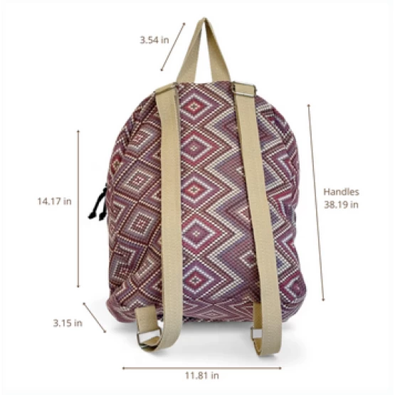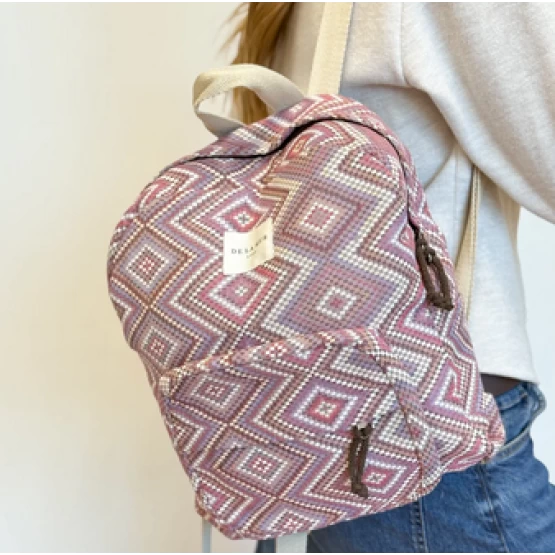 Pink and lilac geometric jacquard backpack with front pocket—practical, stylish, and perfect for carrying your daily essentials with a unique, eye-catching design.