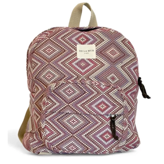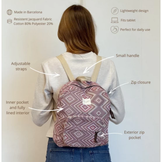 Backpack with adjustable straps and a front pocket. Made from jacquard fabric (80% cotton, 20% polyester) featuring a geometric pattern in pink and lilac tones. Includes an interior zippered pocket. Straps are made from beige cotton herringbone webbing. For proper care, we recommend washing in cold water and not tumble drying.