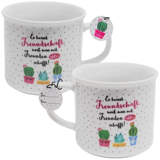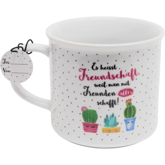 Κούπα από πορσελάνη με όμορφο μοτίβο και μήνυμα στα γερμανικά ES HEISST FREUNDSCHAFT, WEIL MAN MIT FREUNDEN ALLES SCHAFFT!