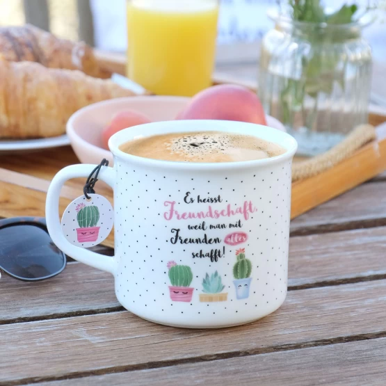 Das perfekte Mitbringsel für einen Kaffeeklatsch mit der besten Freundin: Diese Tasse mit den trendigen Kakteen gibt immer wieder einen Grund sich mit der Freundin auf einen Kaffee oder Tee zu treffen.