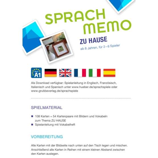 Το Sprachmemo Deutsch „Zu Hause“ περιέχει το βασικό λεξιλόγιο της θεματικής ενότητας «Στο σπίτι», δηλ. το σπίτι και τα δωμάτια, την επίπλωση και τον εξοπλισμό σπιτιού. Υπάρχουν τα παρακάτω λήμματα: Adresse, Aschenbecher, Bad, Balkon, Bett, Bild, Dach, Dusche, Fenster, Fernseher, der Flur, Garten, Gast, Geschenk, Geschirrspülmaschine, Glühbirne, Haus, Heizung, Herd, der Keller, Klingel, Kochtopf, Kopfkissen, Küche, Kühlschrank, Lampe, Miete, Möbel, Ofen, Regal, Schere, Schlafzimmer, Schlüssel, Schrank, Seife, Sessel, Sofa, Spiegel, Spielzeug, Tablet, Teppich, Tisch, Tischdecke, Toilette, Treppe, Tür, Vorhang, Wand, Waschmaschine, Wasserhahn, Wohnung, Wohnzimmer, Zimmer