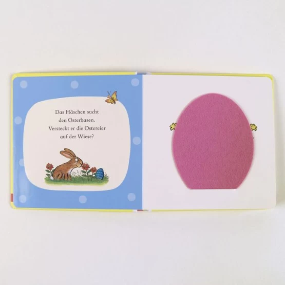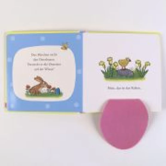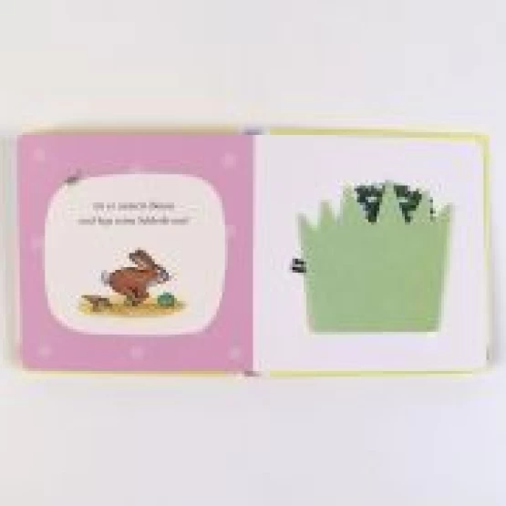 Das Häschen sucht den Osterhasen. Unterwegs trifft es ein Küken, den Maulwurf und das Lämmchen - und schließlich auch den Osterhasen!
