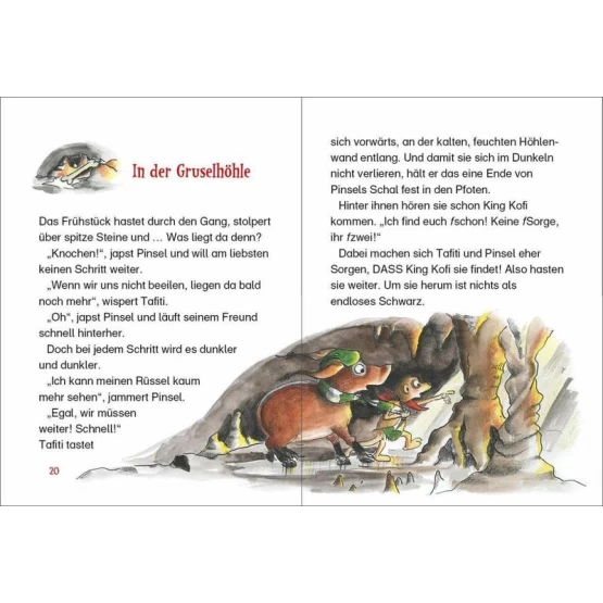 Schnell weg! King Kofi verfolgt Tafiti und Pinsel! In letzter Sekunde schlüpfen Erdmännchen und Pinselohrschwein in eine Höhle. Aber zum Verschnaufen bleibt keine Zeit. Denn schon kommt ihnen der hungrige Löwe hinterher. Immer tiefer fliehen die Freunde in die Höhle hinein. Bald ist es stockdunkel und sie wissen nicht mehr, wo sie sind. Und was noch schlimmer ist, plötzlich ertönt eine unheimliche Stimme ...