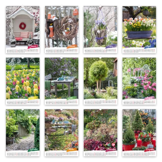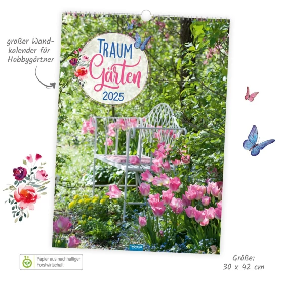 Die Schönheit der Natur ist nicht nur eine Wohltat für Augen und Seele, sie ist auch ein Schlüssel zu mehr Lebensfreude. Lassen wir uns also verzaubern vom Lächeln der Natur in seiner schönsten Form, der Gartenkunst! Unser dekorativer Großbild-Wandkalender TRAUMGÄRTEN im Format 34 x 48 cm entführt in zwölf zauberhafte Traumgärten, die in den eigenen vier Wänden oder im Büro Monat für Monat aufs Neue farbenfrohe Lebensfreude versprühen. Die herrlichen Fotos lassen dabei nicht nur so manche Sorge verfliegen, sie laden auch die Gedanken zum Verweilen ein und bilden so zugleich ein Blickfang und einen wohltuenden Ruhepol im Raum. Dank des gut ablesbaren Kalendariums und farbig markierter Feiertage hilft der Kalender neben all den fantastischen Fotos auch wunderbar beim Organisieren des Alltags. Das perfekte Geschenk um Familienmitgliedern, Freunden, Kollegen oder sich selbst ein ganzes Jahr lang Freude und Inspiration zu schenken. Und ein Muss für alle Freunde der Gartenkunst!