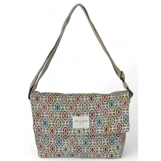 Μίνι τσάντα σε στυλ crossbody με μακρύ, ρυθμιζόμενο, beige ριγέ λουρί από βαμβάκι. Κατασκευασμένο από παχύ Jacquard ύφασμα με γεωμετρικό σχέδιο σε μπεζ, ροζ και μπλε. Με φερμουάρ επάνω μια εσωτερική τσέπη με φερμουάρ και γκρι φόδρα. Για την καλύτερη φροντίδα, συνιστούμε να πλένετε τα χέρια σας σε κρύο νερό και να μην τα στεγνώνετε στον στεγνωτήρα.