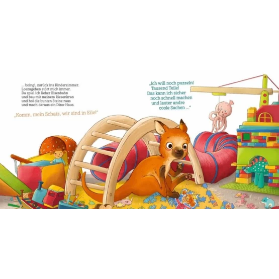 Es ist noch dunkel und schon springt das Kängurukind Quirin begeistert und voller Energie in den neuen Tag hinein. Doch schnell kann die Stimmung kippen! Da stehen die Eltern nicht rasch genug morgens auf - und Quirin bricht in Tränen aus. Dort heißt es: Anziehen! Losgehen! Und wütend springt Quirin davon. Dann zwickt die Hose, stören die Knöpfe und draußen erwartet ihn all das Schnelle, Schrille, Stinkige! NEIN! Quirin steckt in einer Achterbahnfahrt der großen Gefühle. Zum Glück weiß Mama Rat: Beutel auf, Quirin rein, Beutel zu, Quirin kommt zur Ruh! Co-Regulation á la Känguru!