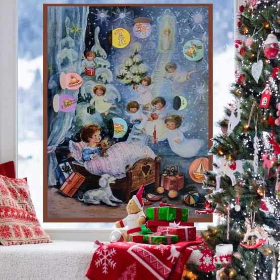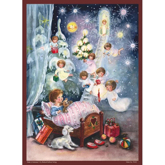 Dieser liebevoll gestaltete Adventskalender lässt nicht nur Kinderaugen leuchten! Ein nostalgisches Motiv, so schön wie in der Kindheit! Ist es ein Traum, oder gar Wirklichkeit,, dass die Engel über eine Himmelsleiter herabsteigen und das Kind in seinem Bettchen besuchen und Geschenke mitbringen? Der Phantasie sind keine Grenzen gesetzt! Lassen Sie sich verzaubern und träumen sie mit von Engeln, der offenen Himmelspforte und den sehnsüchtig erwarteten Geschenken zu Weihnachten. Weihnachtlicher Glitzer vervollständigt diesen Adventskalender und jedes Türchen bringt Sie Weihnachten dem Weihnachtsfest einen Tag näher