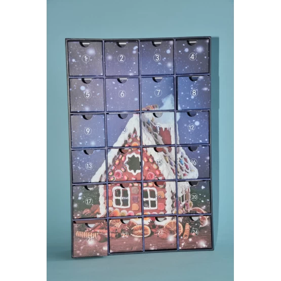 Χριστουγεννιάτικο ημερολόγιο ζαχαρωτό σπιτάκι . Με τα συρτάρια αριθμημένα από το 1 έως το 24, μπορείτε να ανοίγετε ένα συρτάρι κάθε μέρα μέχρι την παραμονή των Χριστουγέννων! Μην ξεχάσετε να προσθέσετε μικρά δωράκια ή γλυκίσματα!