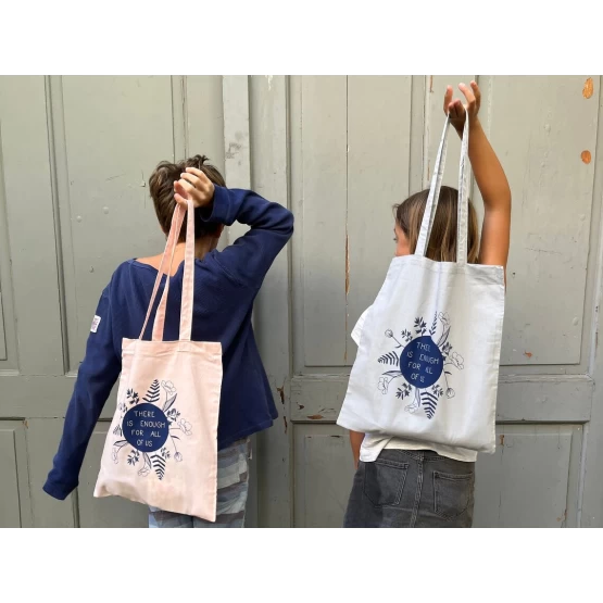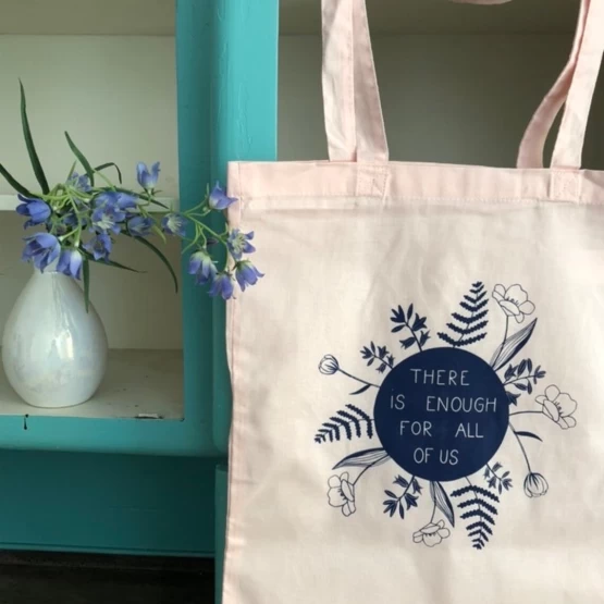 Υφασμάτινη τσάντα για τα ψώνια από 100 % βαμβακερό ύφασμα, σε πολύ απαλό ροζ χρώμα με floral μοτίβο τυπωμένη με το χέρι και μήνυμα THERE IS ENOUGH FOR ALL OF US