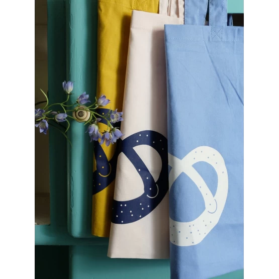 Υφασμάτινη τσάντα για τα ψώνια από 100 % βαμβακερό ύφασμα, σε πολύ απαλό ροζ χρώμα με στάμπα Brezel τυπωμένη με το χέρι.